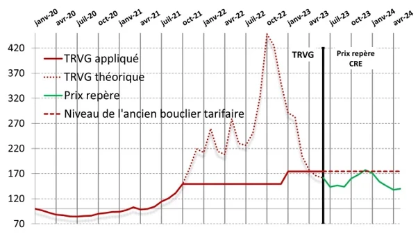 Le graphique ci-dessous montre l’évolution du prix du gaz naturel depuis 2020, par rapport à une base 100 au 1/1/2020. Nous sommes sous le prix de décembre 2022 lorsque le bouclier tarifaire avait été appliqué et augmenté de 15%. TRVG = Tarif Réglementé de Vente du Gaz, supprimé au 30/6/2023.